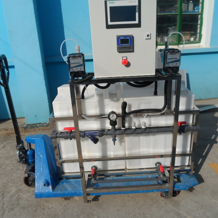 ?溶液可通過定量泵與進(jìn)水在線稀釋至使用濃度,并通過靜態(tài)混合器得到均勻溶液。