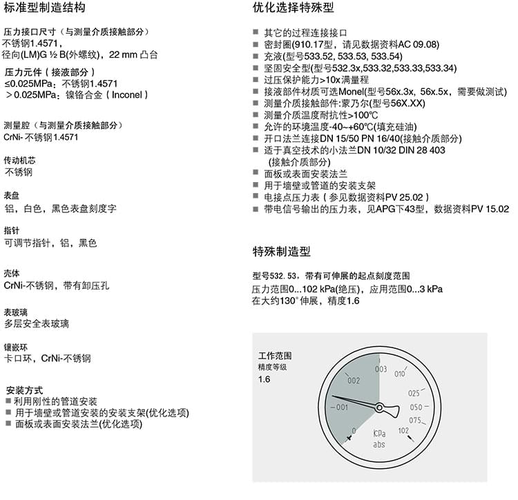 3. 絕壓表,帶有膜片,CrNi-不銹鋼制造結(jié)構(gòu)壓力表:516.11 516.12 532.51 532 .52 532.53 532.54