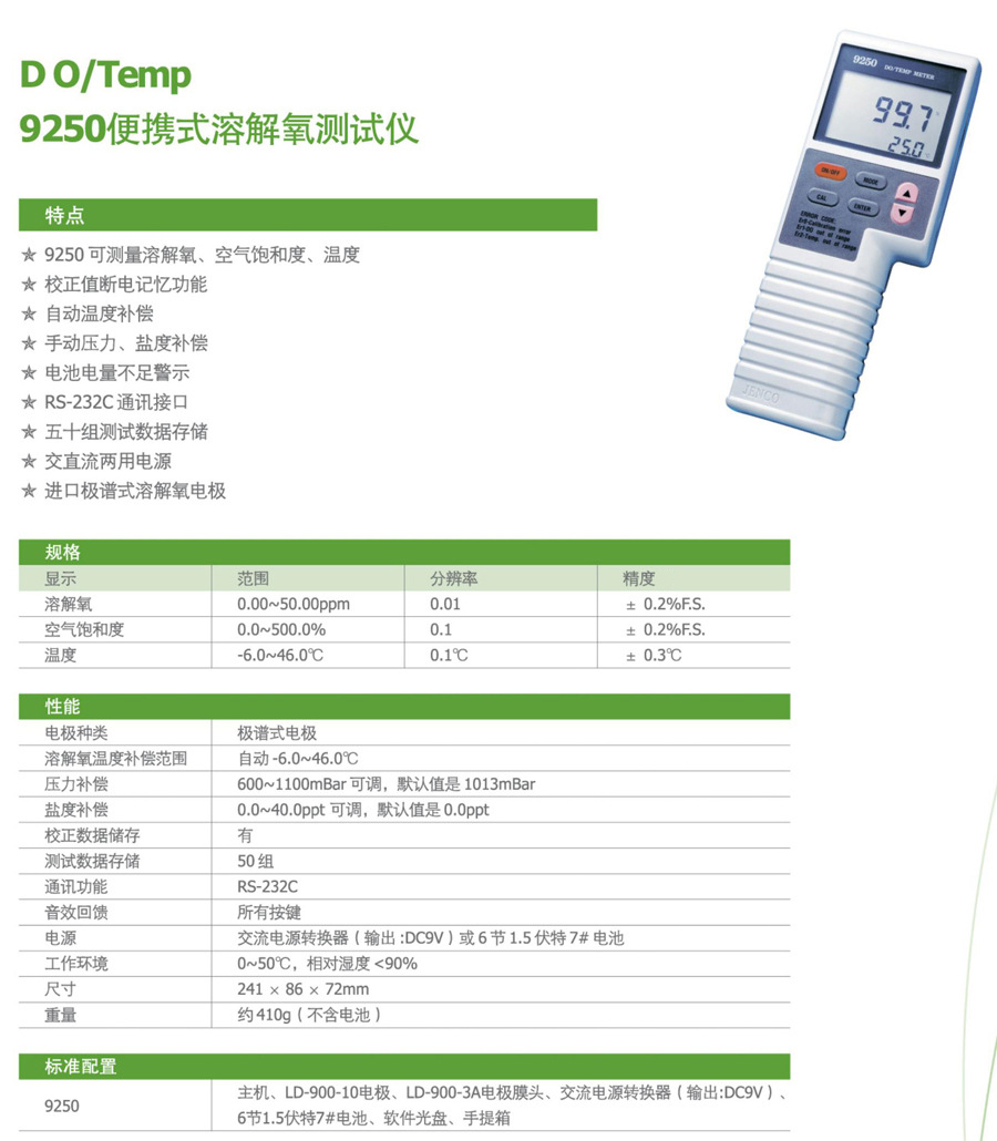 參數:0~50ppm,0~500%,-6~46.0℃,鹽度補償范圍0~40.0ppt,壓力補償范圍600~1100mBar,50組數據存儲,RS-232C(極譜式)