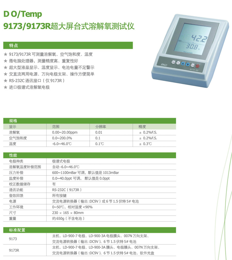 溶氧量測試儀使用特大LCD顯示面板,使用簡易。使用極譜型傳感器,可替換式膜片、可編程式壓力補償、600至1000 mBar、鹽度補償功能、0至40.0 ppt。透過雙顯示LCD熒幕顯示溶氧量、溫度,RS-232-C界面。ATC為10K熱阻器,使用電源為115/230V調(diào)配器或電池。